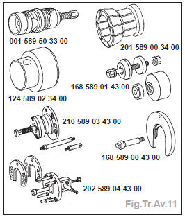 extracteur 001 589 50 33 00 et 202 589 04 43 00, extracteur et emmanchement 168 589 01 43 00 et 210 589 03 43 00, pince de serrage 201 589 00 34 00, pièce de pression 124 589 02 34 00 et plaque d'appui 168 589 00 43 00.