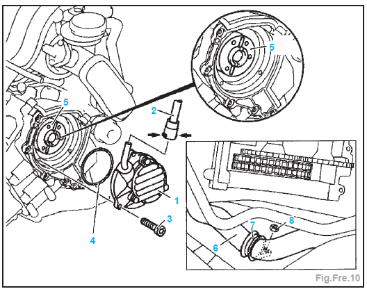 Détacher la durit de refroidissement (6) se trouvant sur le côté à droite dans le compartiment moteur, contre la carrosserie (Fig.Fre.10).